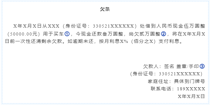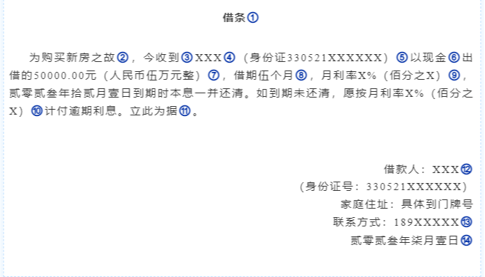 注意:借条书写中如有涂改的,应要求借款人在涂改处按捺手印,或要求借款人重新书写借条。借条书写完成后,为防止篡改,借款人可拍照留存,或复印一份留存(并请出借人签注“该借条复印件与原件一致”)。