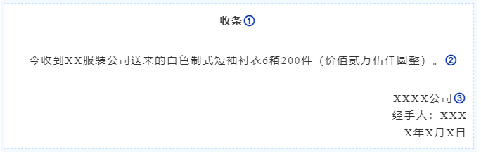 注意:收条要求将所收到的物品、钱款的具体数目以及物品的大小规格式样等说明,同时还要写清是从谁那儿收的。收条的落款要求经手人签名盖章,注明日期,而不能仅仅有个单位的名称。收条不能涂改,欠款数目也要大写。