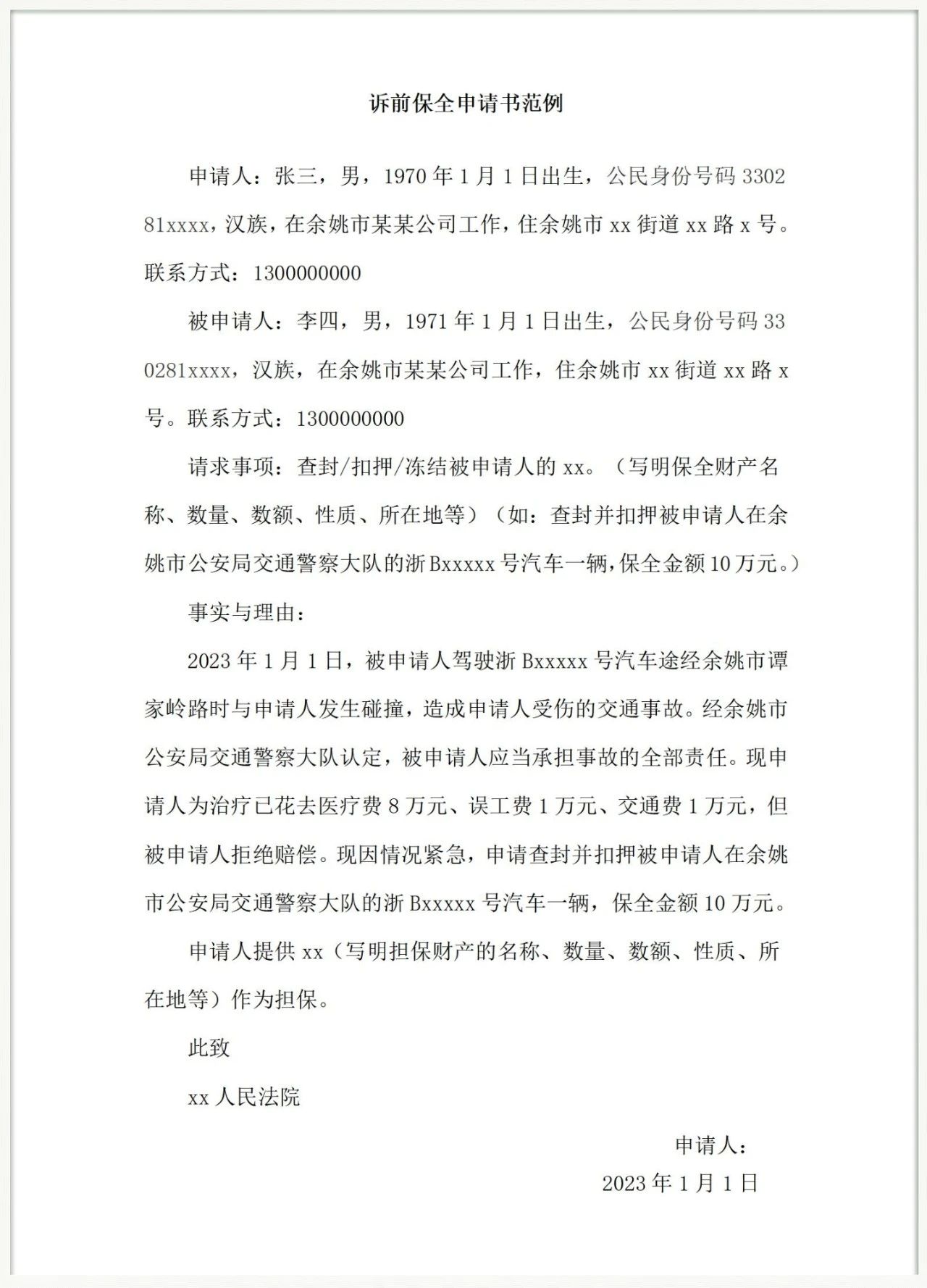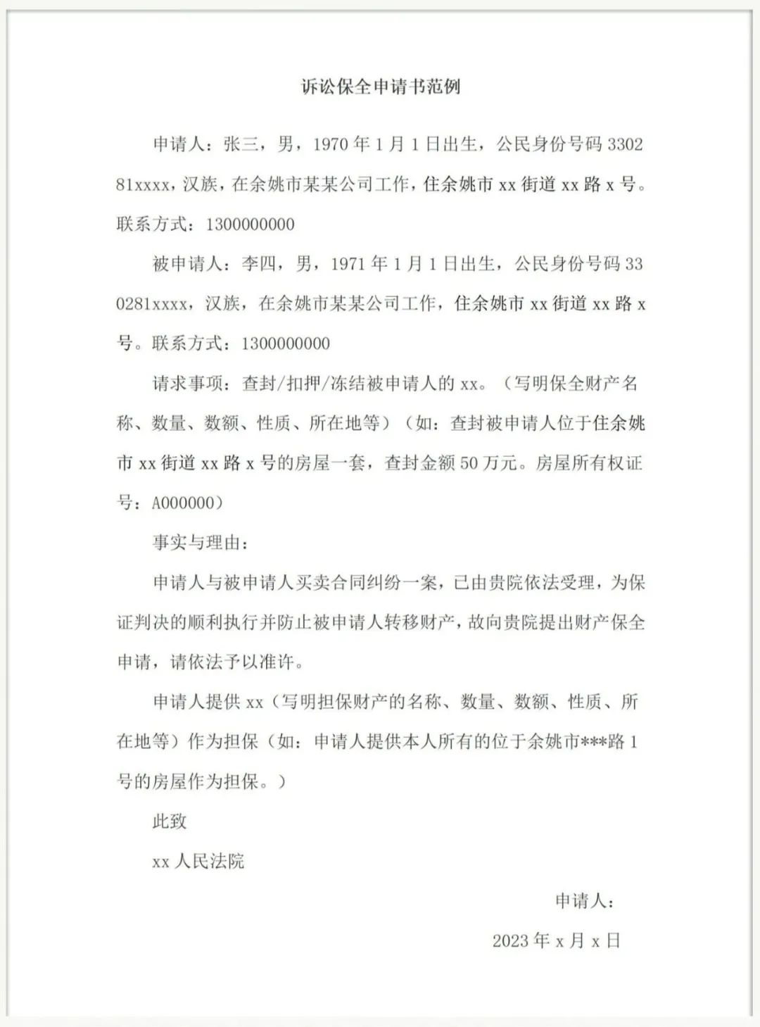 财产保全申请书模板